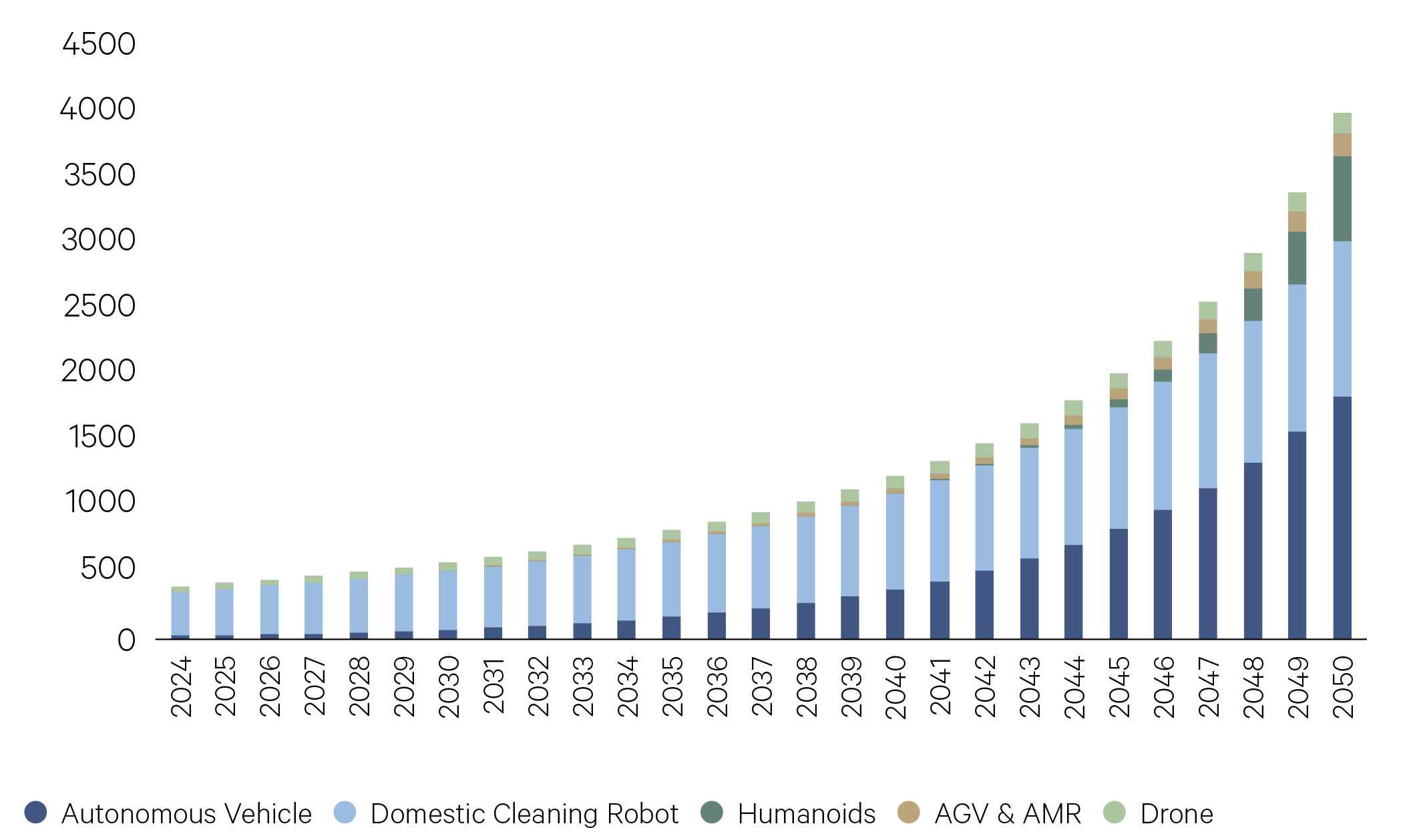 Autonomous vehicles (AVs) are expected to scale rapidly due to AI improvements enhancing safety and decision-making. Fully autonomous vehicles are projected to increase from 27 million currently to 1.9 billion by 2050, with consumer cost per mile dropping from $0.70 to $0.25 within a decade. The growth in robotaxis has the potential to significantly change urban transport with the most recent vehicles from Waymo having a 500 metre detection range.