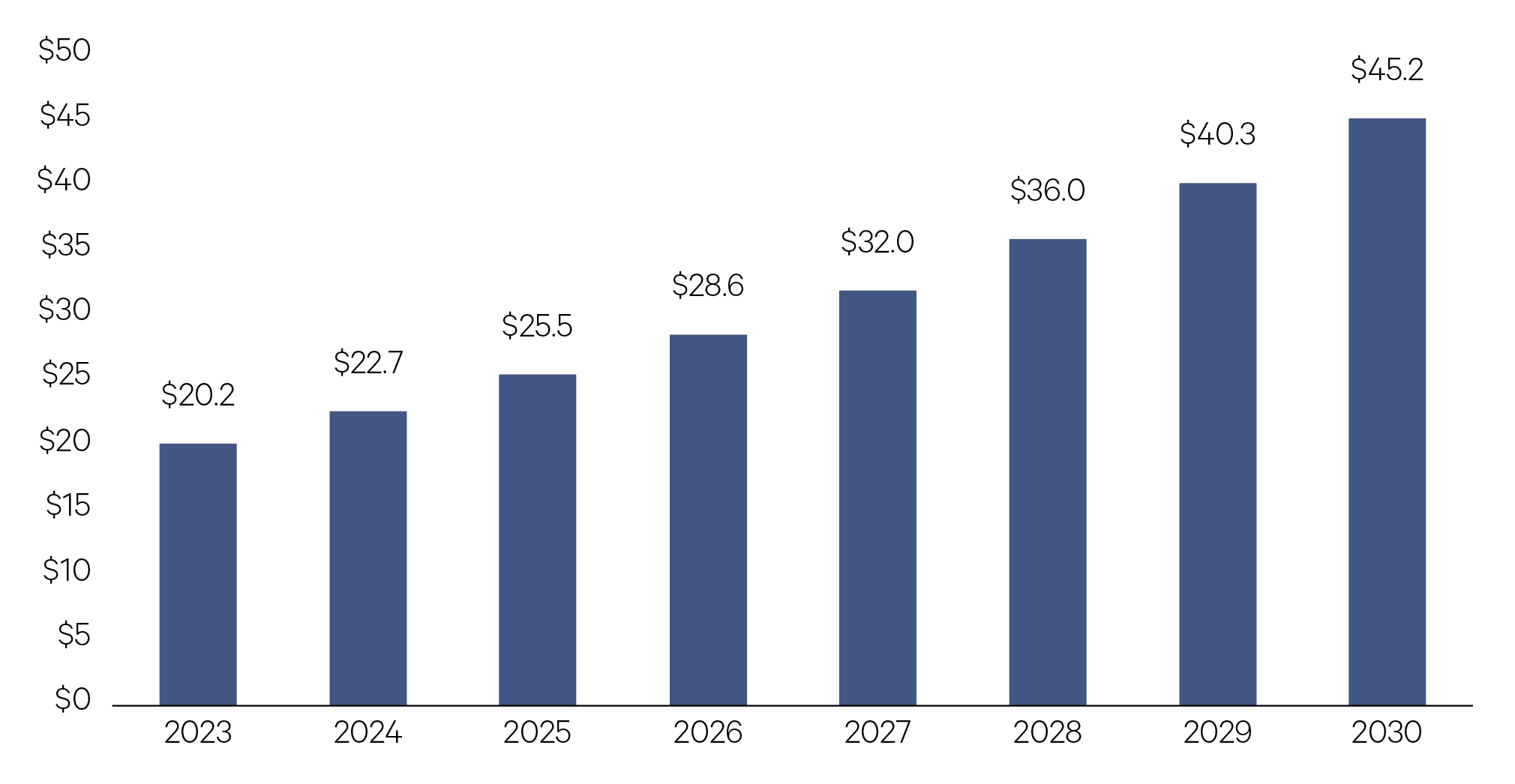 Drones have seen wide adoption across a number of industries including construction, agriculture, real estate, oil and gas, utilities, manufacturing and logistics. The enterprise drone market is forecast to grow from $16 billion today to $29 billion by 2030.
