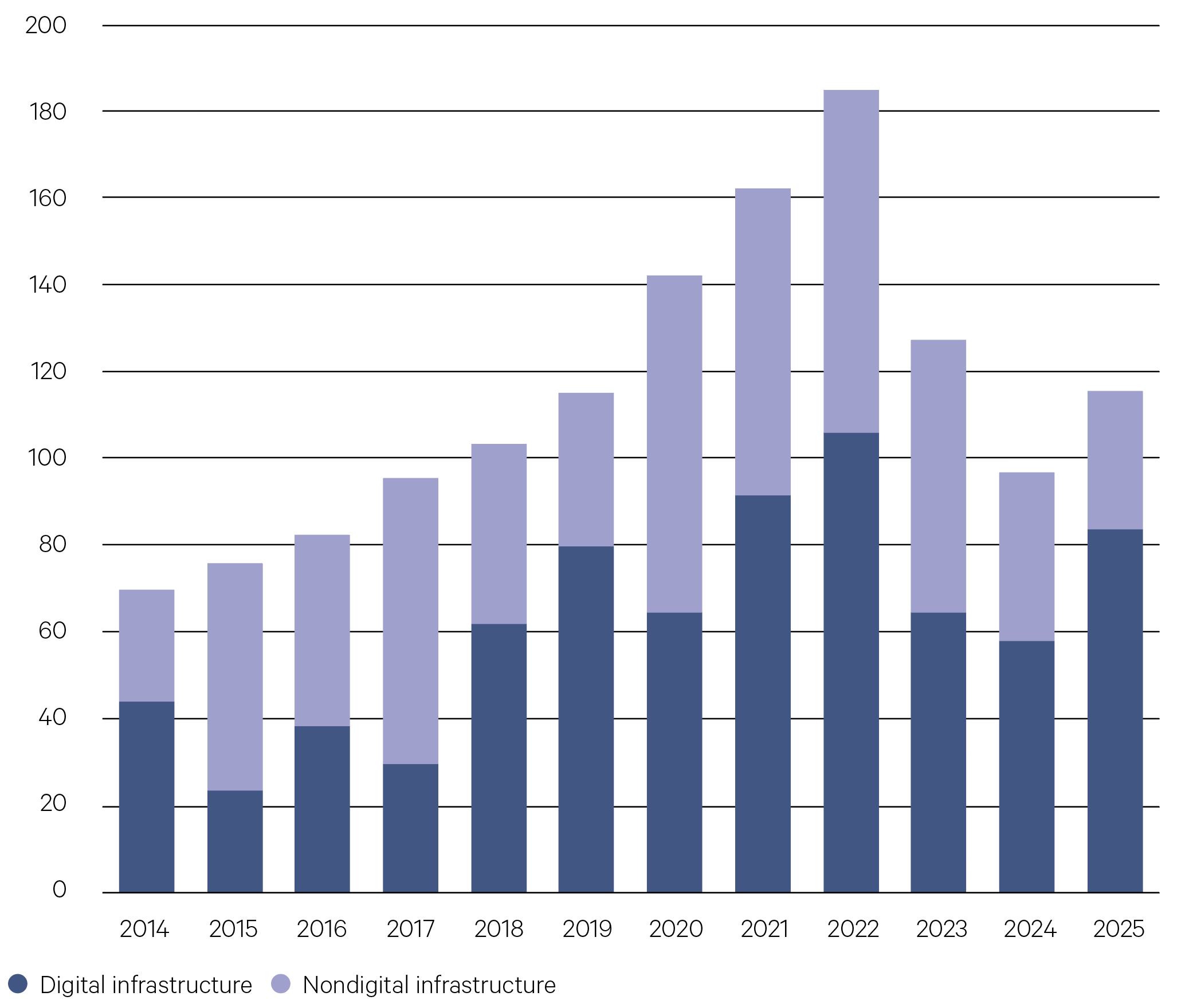 Infrastructure capital raised by investment type ($USbn)