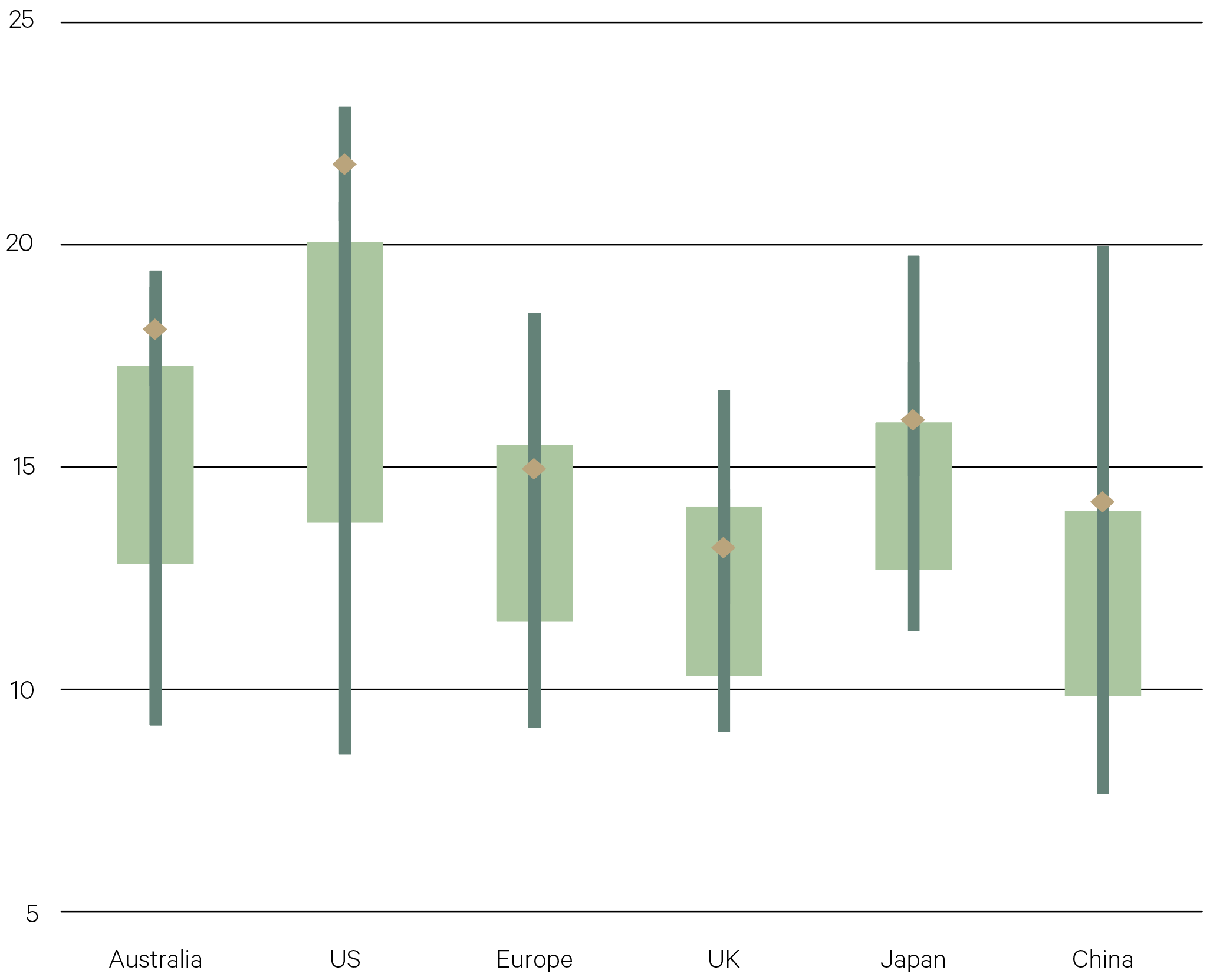 Valuations elevated, particularly in Australia and U.S. (Current P/E vs Long term average)