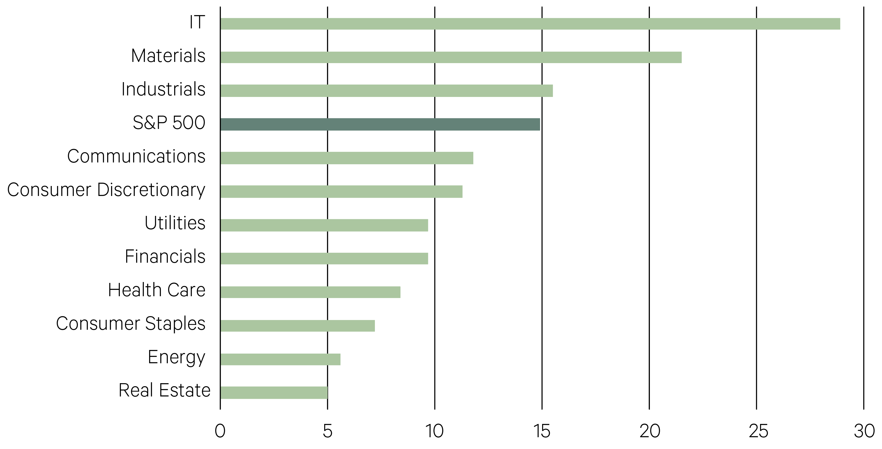U.S. earnings broadening, but IT leading the way (S&P 500: 2026 estimated sector earnings growth) (%)