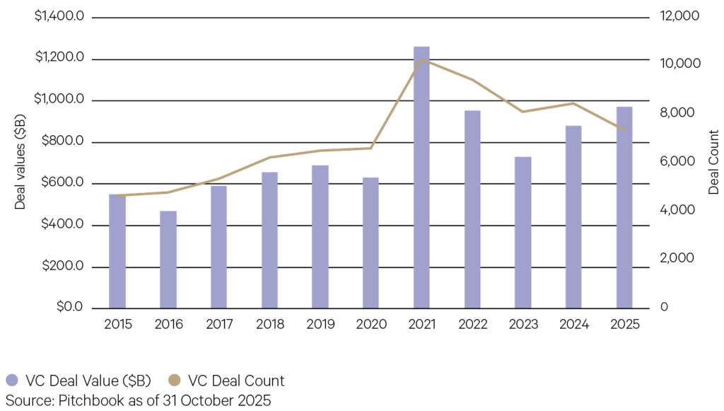 Private equity (PE) dealmaking conditions are steadily improving. The combination of rate cuts, elevated levels of dry powder and clarity around tariff implications has allowed sponsors to deploy increased levels of capital. Pitchbook report that by October 2025, there were 7,370 deals announced or completed within the US PE ecosystem, amounting to a total value of US$969.8 billion. This is the highest deal value recorded since the peak in 2021. The number of deals suggests another robust year ahead, which could exceed 2024’s activity, once Q4 is included.