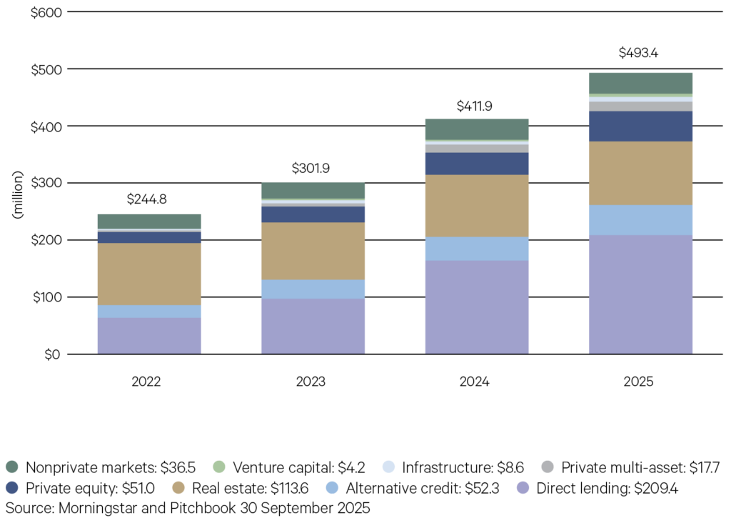 The semiliquid fund market has become one of the most rapidly expanding sectors within private markets. In the twelve months leading up to 30 September 2025, US$51 billion in net cashflow was allocated to evergreen investment funds, raising total assets under management for these funds to US$493 billion—more than twice the US$244 billion recorded in 2022.