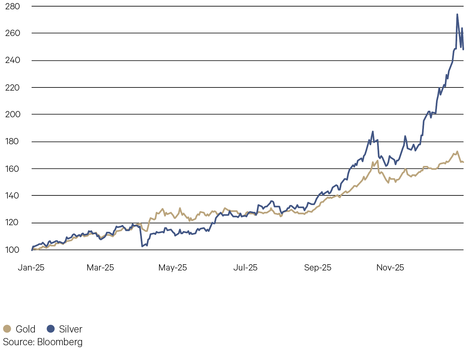 Chart 2: Gold and silver price (Index 01/01/2025=100)