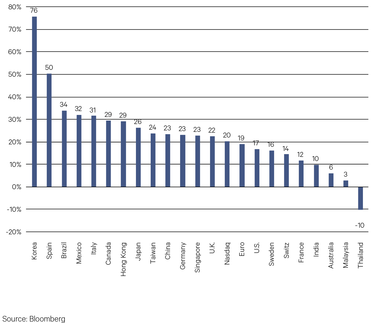 Performance diverged sharply even within regions, with Korean equities up 76%, supported by a powerful semiconductor and AI-related earnings recovery and reinforced by targeted fiscal stimulus, including government support for technology investment, manufacturing capacity, and household income. In contrast, Thailand fell 10%, weighed down by weaker domestic growth, tourism sensitivity, and limited exposure to global technology cycles.