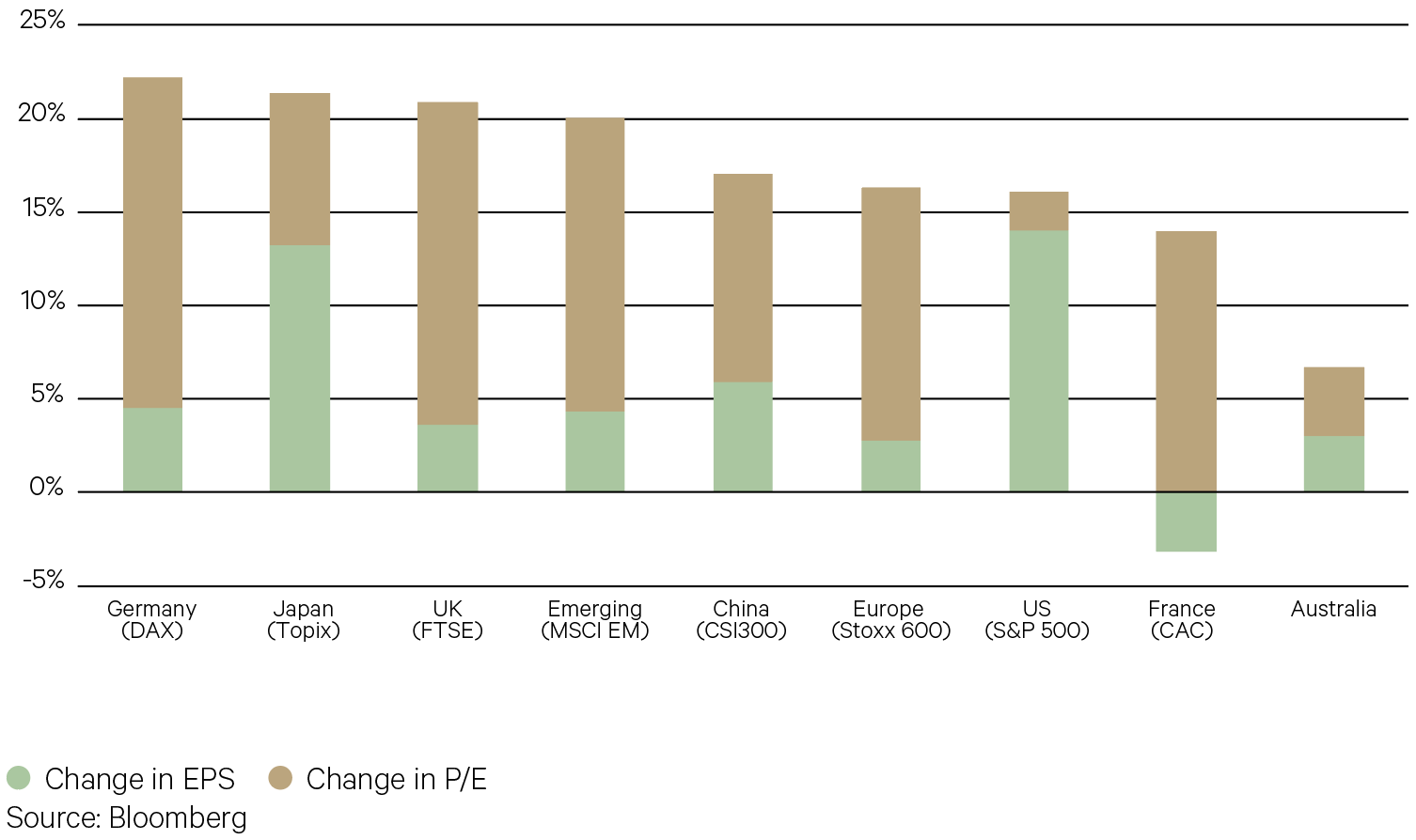Equity returns were strong across 2025, with a mix of earnings and P/E expansion driving returns through a volatile 12 month period. Among the leaders were Germany and Japan, while the US was a surprising laggard. While the US had superior earnings growth to most markets, valuation expansion was much more modest overall, as others reduced the valuation gap.