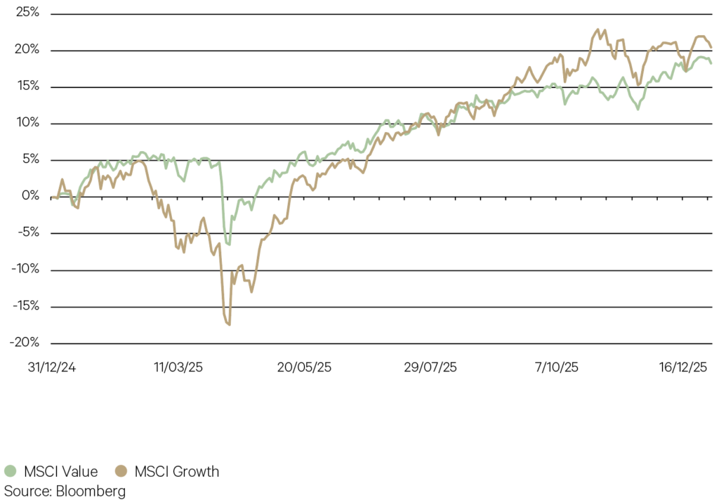 For the third year in a row, growth equities outperformed value equities, though the difference over the 12 months was marginal. Growth equities lagged in the early part of the year as investors became relatively more optimistic on Europe and concerns around AI were raised following the release of DeepSeek. While all markets suffered a drawdown following Liberation Day, technology shares again led the sharp recovery over the following months before tapering towards the end of the year.