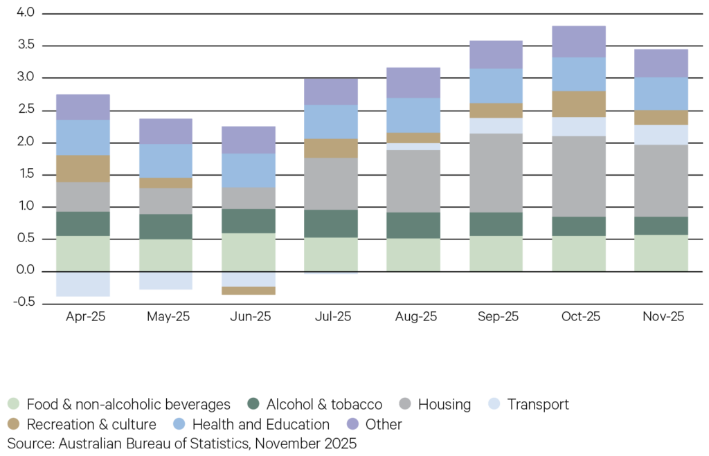 The macroeconomic environment also added a further headwind for the growth sectors of the Australian market. With recent inflation prints trending higher again, this triggered a recasting of expectations for monetary policy for the year ahead, a point recognised by the RBA. After three 25bp cuts to the cash rate over the course of 2025, the consensus view is that we have reached the end of the easing cycle domestically and will possibly see one or two hikes in 2026. Bond yields rose sharply from mid-October, climbing around 70bp.